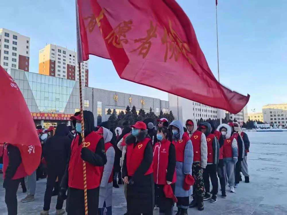 校团委王惠老师宣布冬日“破冰行动”正式开始,每位青年志愿者依次在红旗上签名。公司志愿者按照校青协的安排进行破冰行动。