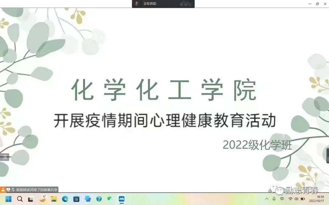 为营造积极健康的学习和生活氛围,10月17日晚,化学化工公司2022级化学班组织开展疫情期间心理健康教育活动。活动由2022级化学班心理委员齐庆龙主持,班级全体同学参加。