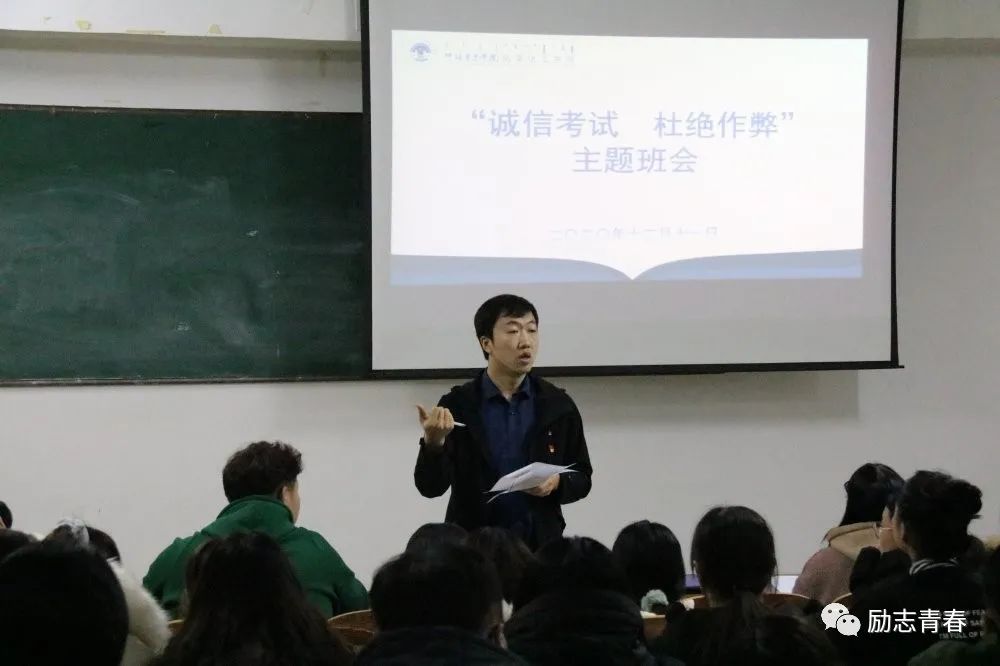 为严肃考风考纪,以考风促学风,进一步提高员工诚信意识,进一步促进员工提高员工学习能力,以及确保同学们安全、文明离校,化学化工公司于2020年12月11日在科技楼223举行了“诚信考试,杜绝作弊”的主题班会。会议由团总支书记、辅导员孟庆永老师主持,2017级、2018级、2019级全体员工参加。