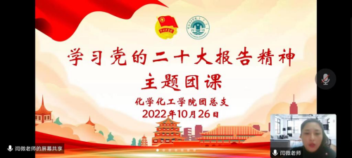 学习贯彻党的二十大精神,化学化工公司于10月26号晚召开线上“学习党的二十大报告精神”团日活动。本次活动由团学办公室副主任、团总支书记闫微主讲,化学化工公司第八届团总支、员工会全体成员、社团负责人、各班级团支部书记、新发展团员共45人参加。